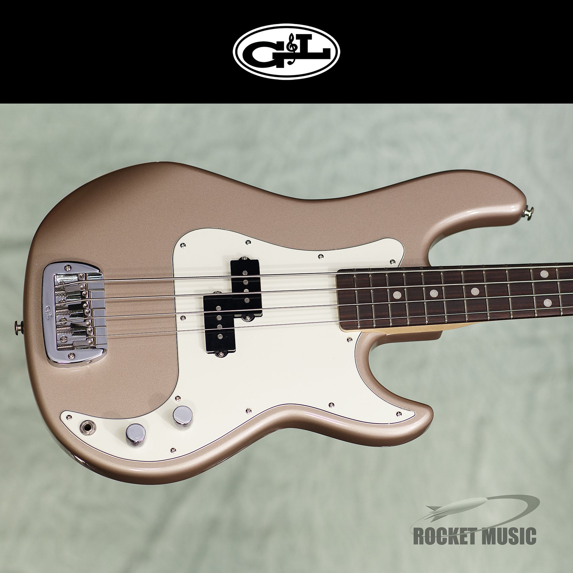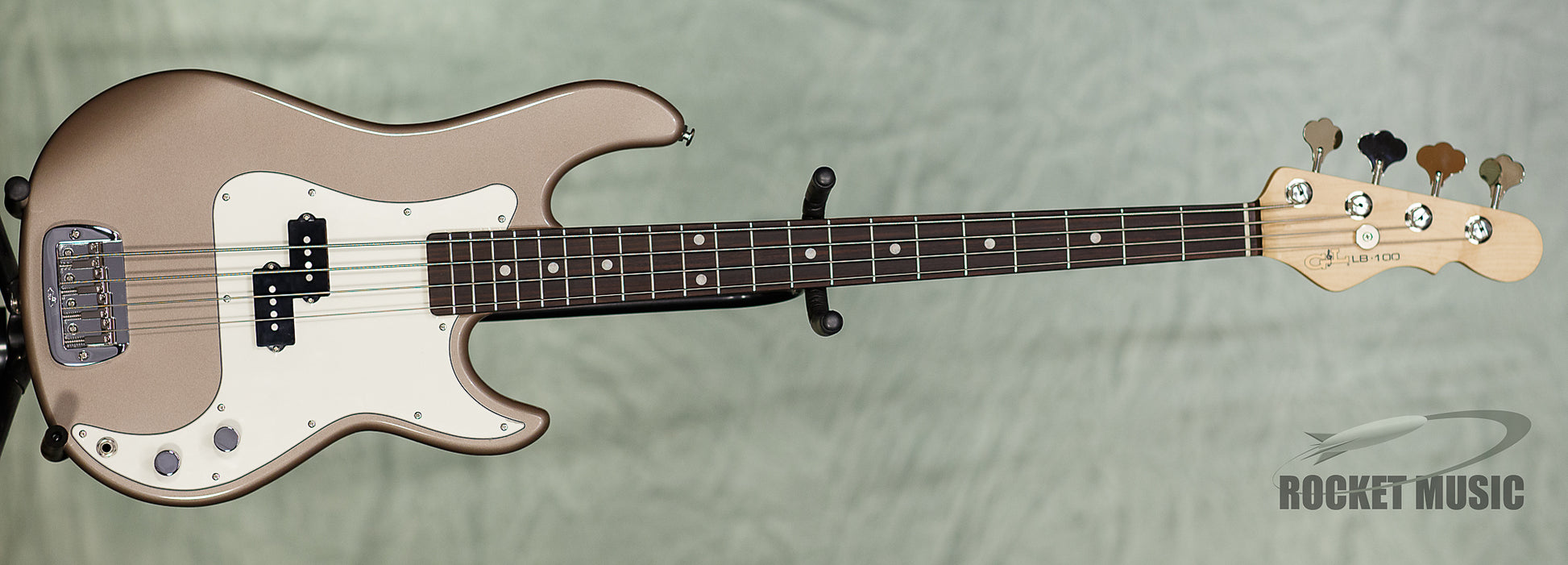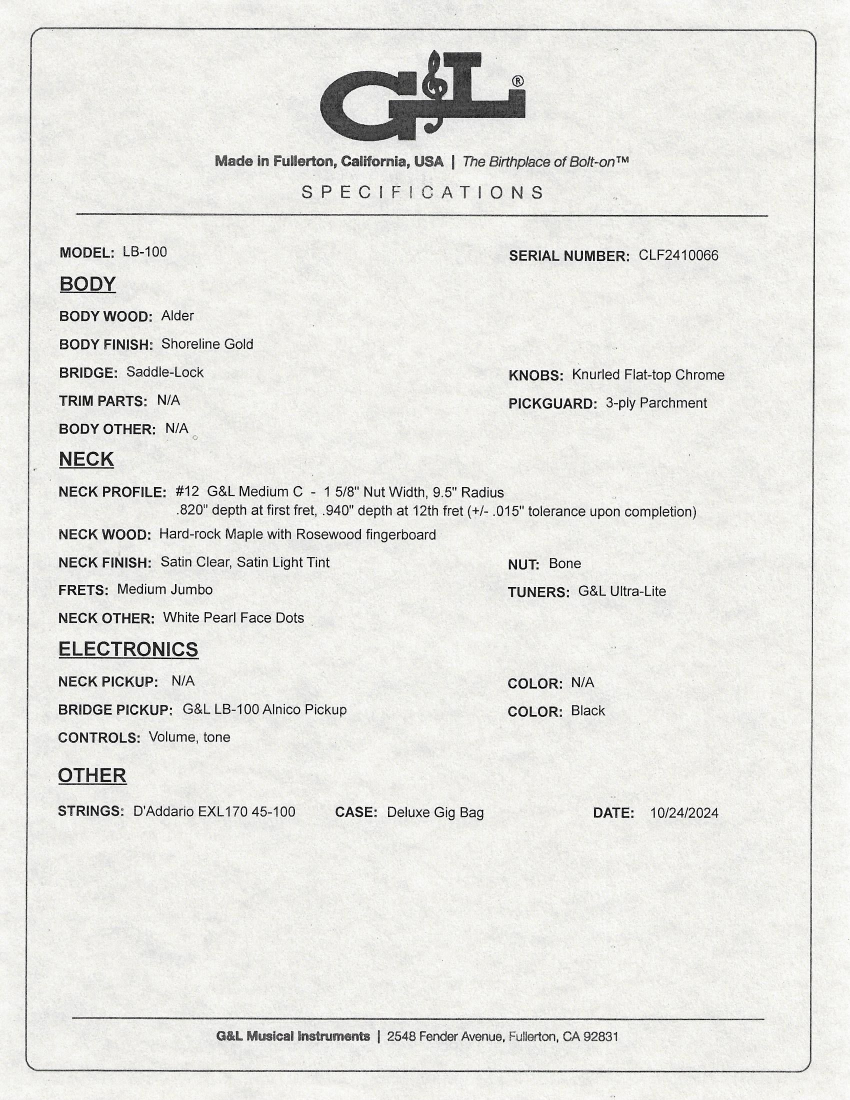 Here's a lovely LB-100 from G&L in Shoreline Gold. The neck is Maple, the fretboard is Indian Rosewood, and the pickguard is 3-Ply Parchment. The bass weighs 8.7 lbs.