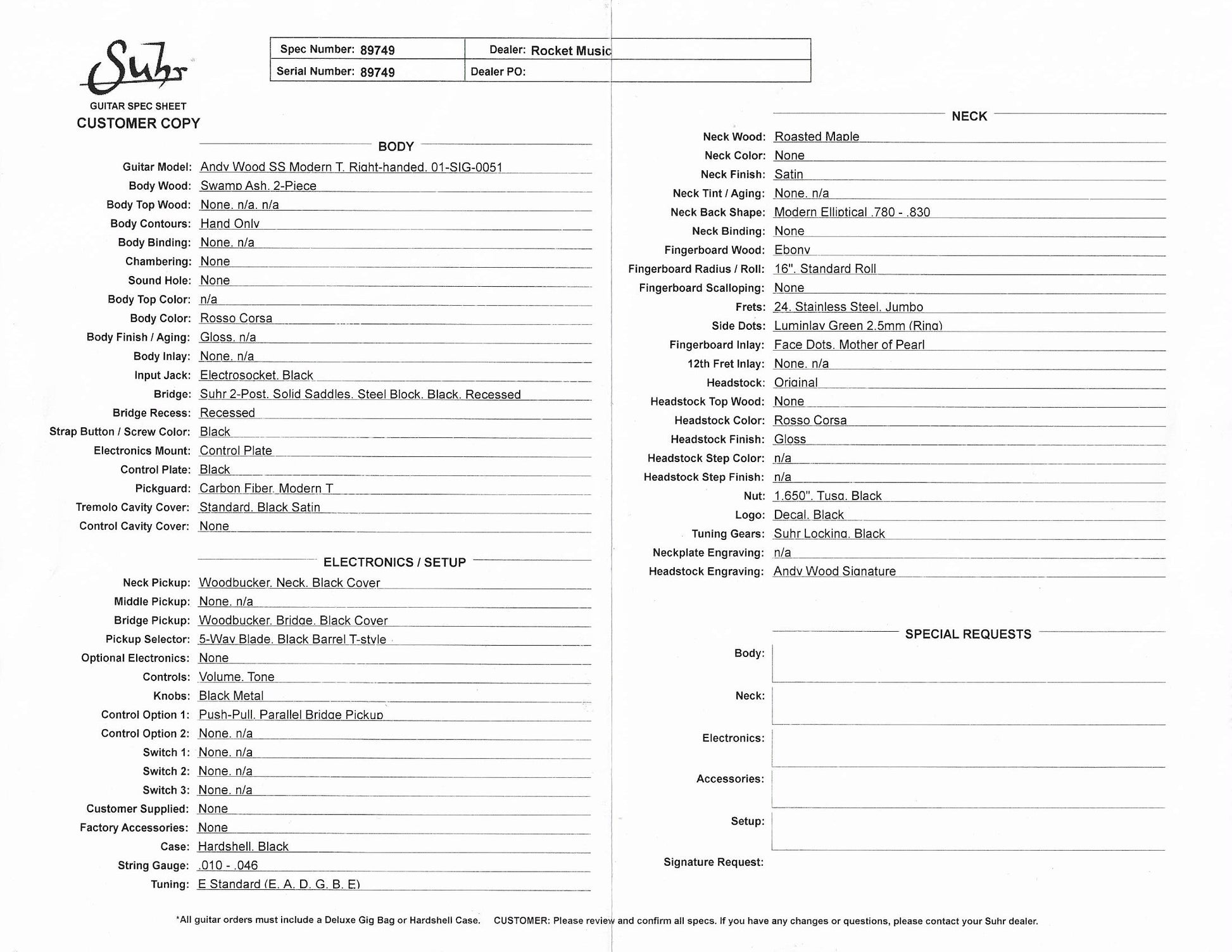 Crafted from Swamp Ash, available in Arancio Orange or Rosso Corsa and paired with carbon fiber pickguard, a roasted maple neck and ebony fingerboard, the Andy Wood Sig embodies Suhr’s commitment to premium craftsmanship and Andy’s vision of the perfect instrument. The jumbo stainless steel frets, .780-.830 Modern Elliptical neck profile, and 16” fingerboard radius ensure effortless playability and blazing speed.